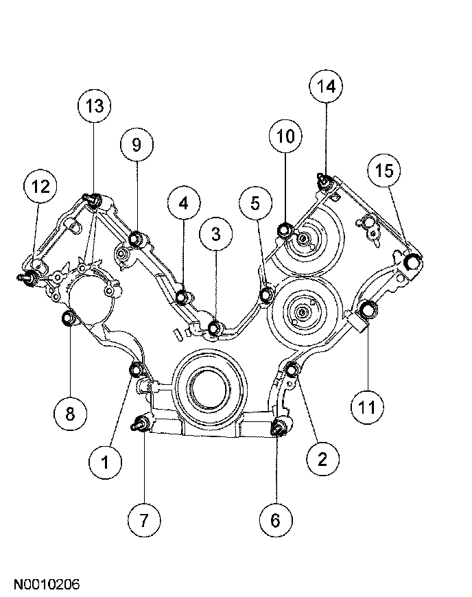 Engine Front CoverTighten the engine front cover fasteners in sequence in 2 stages: