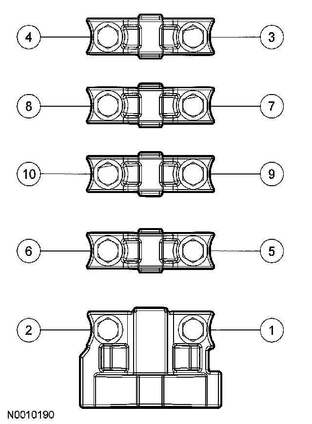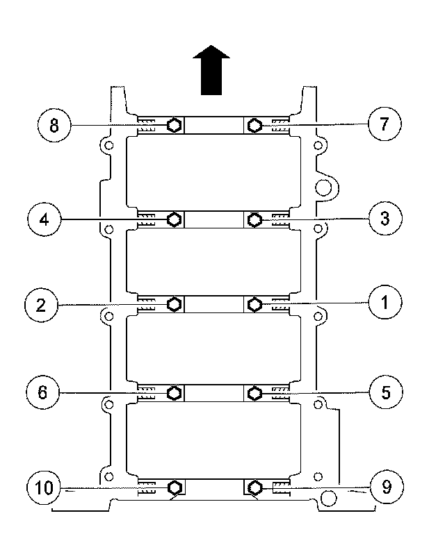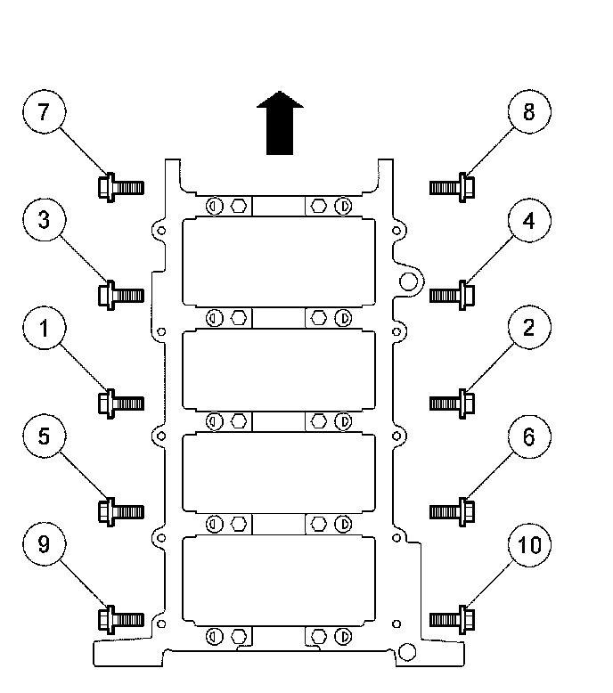 Install the vertical main bearing cap fasteners and tighten in the sequence shown: