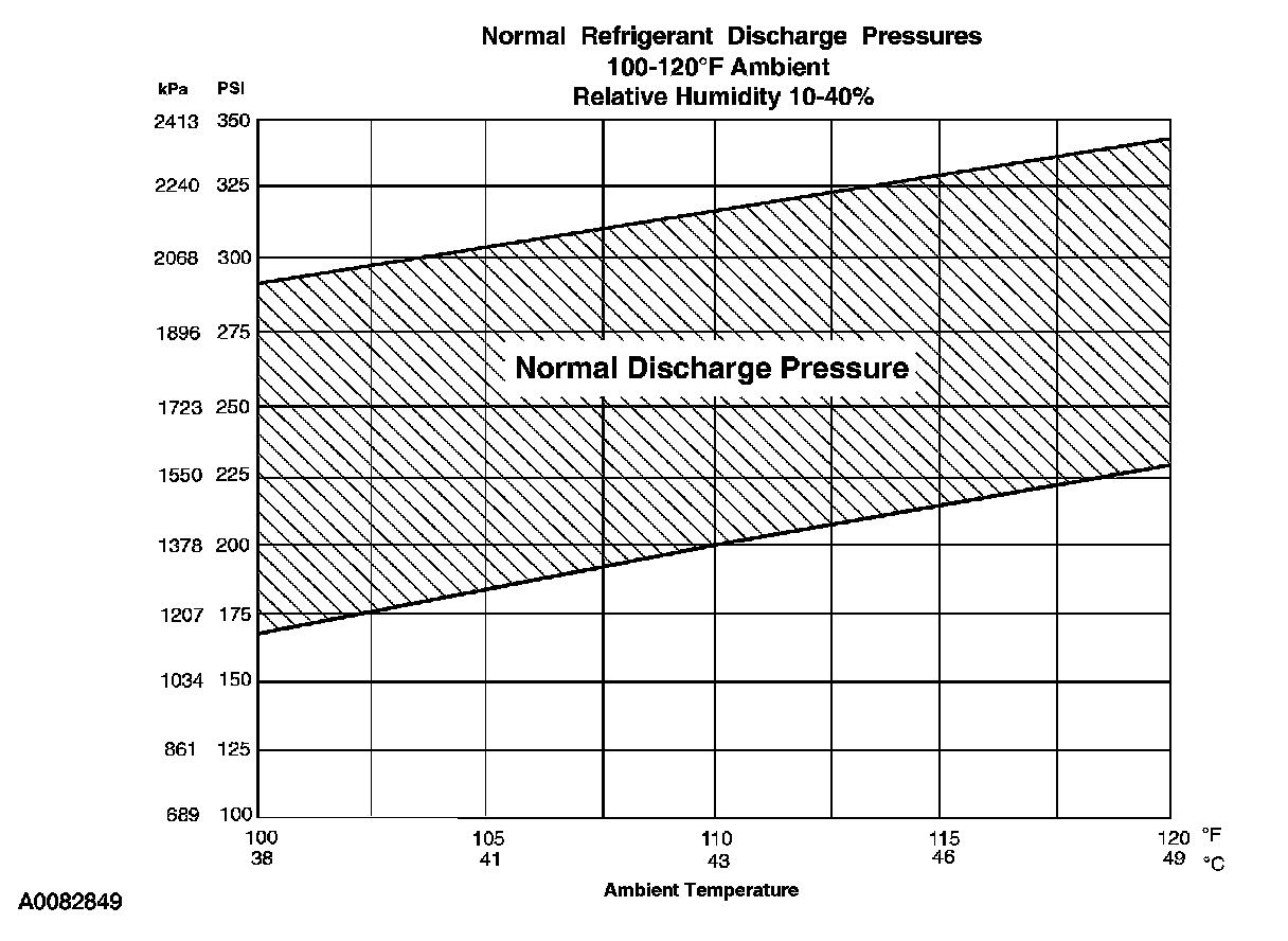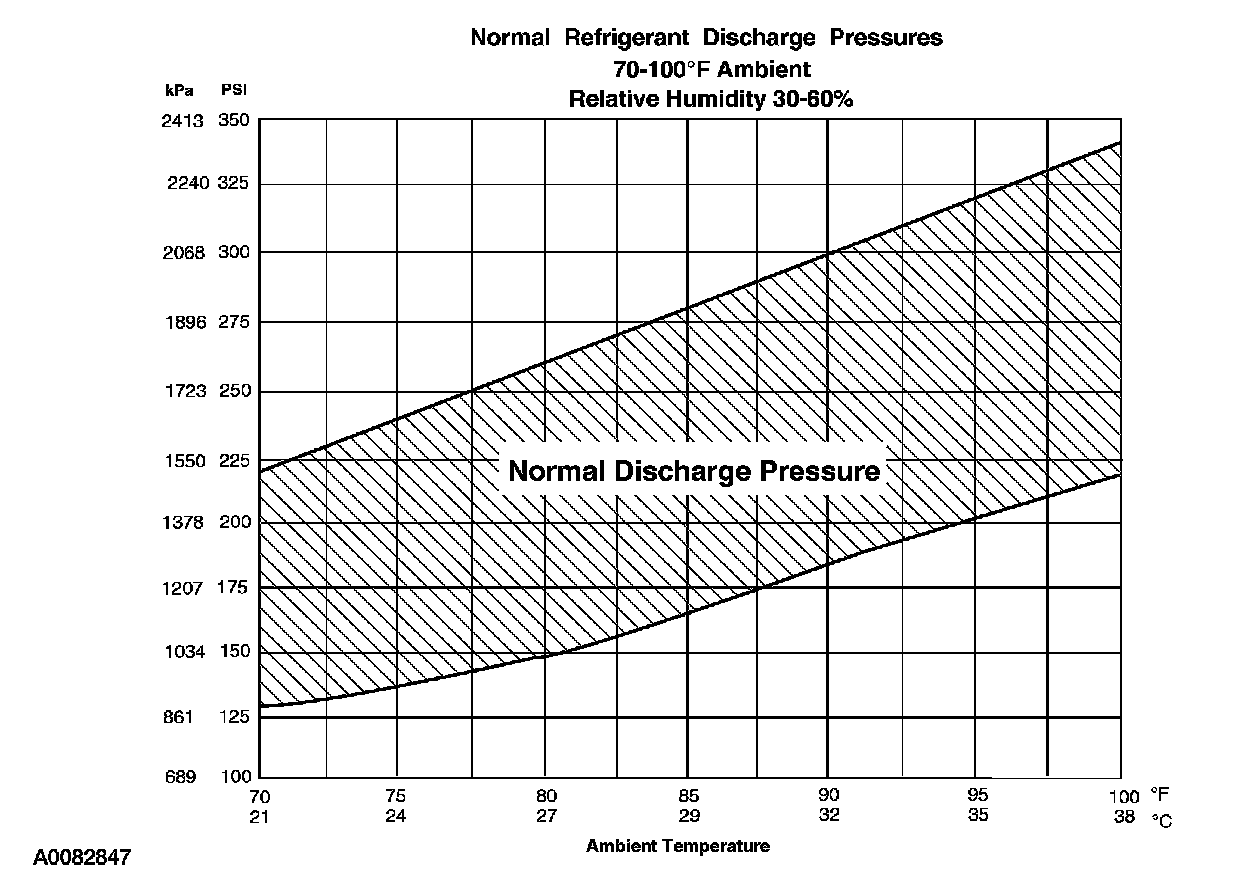 8. Determine if the discharge pressure falls within the normal operating limits using the Normal Refrigerant Discharge Pressures chart.