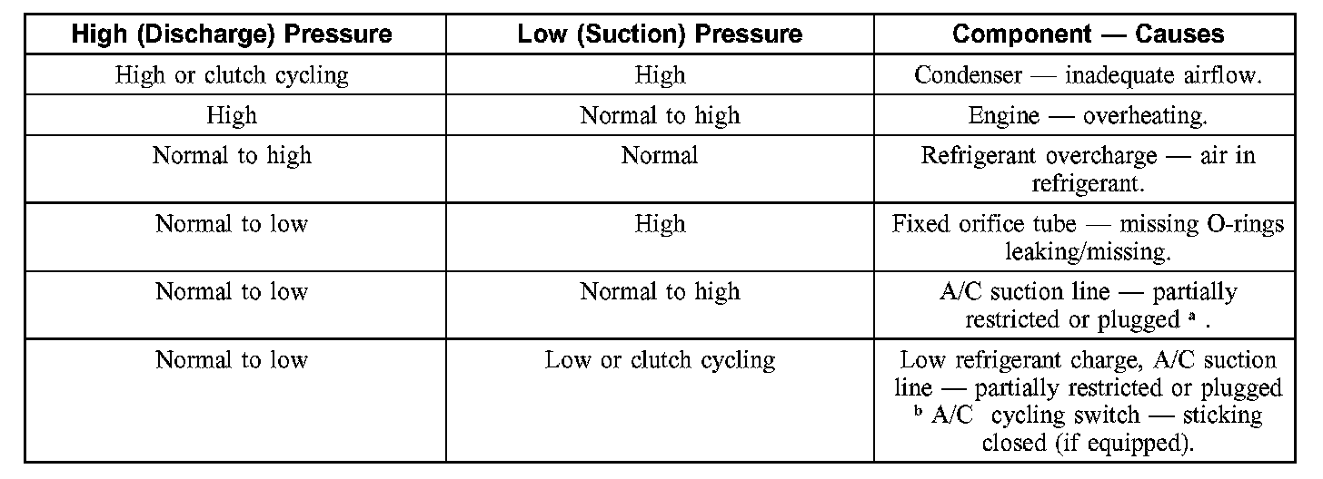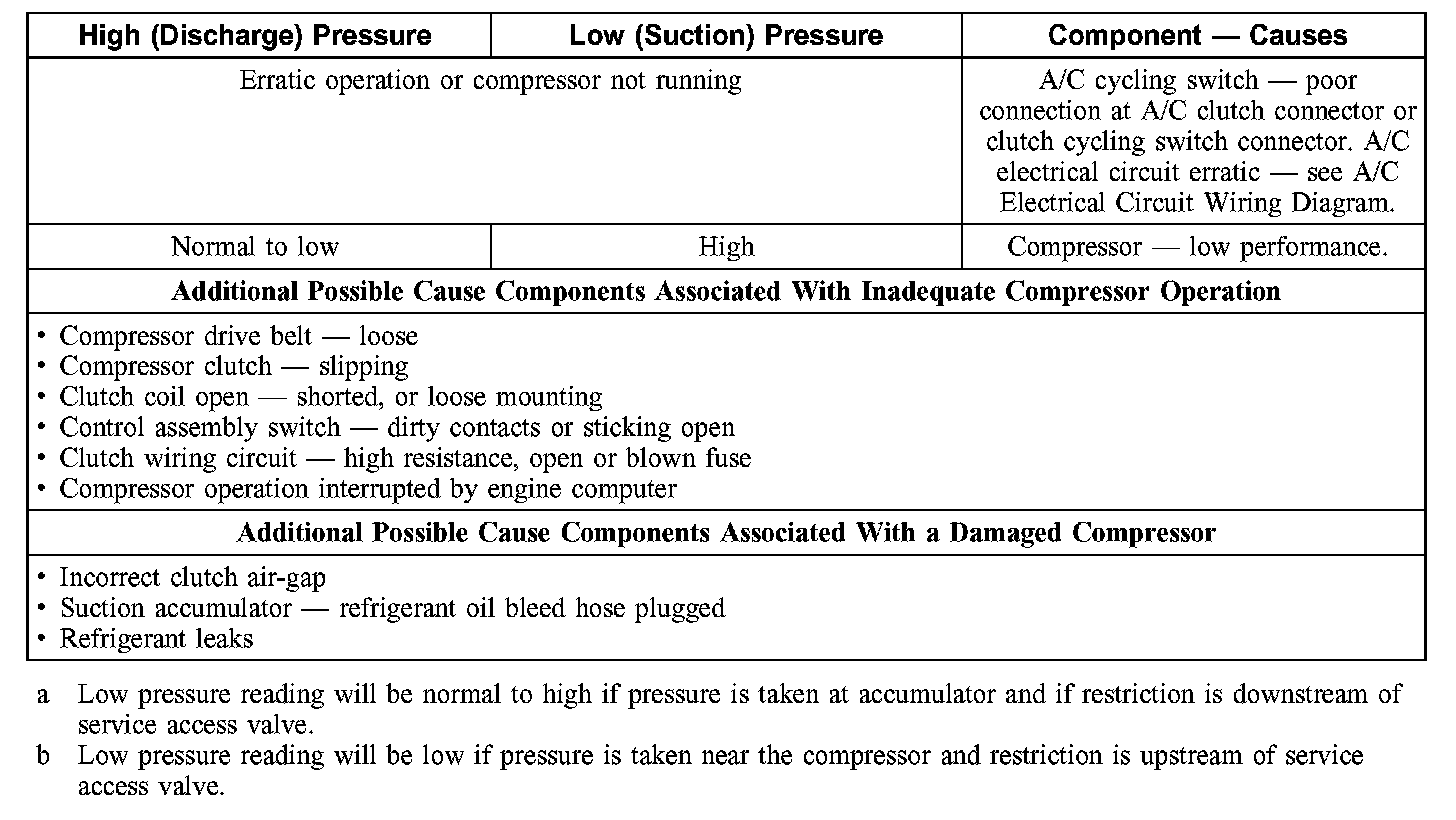 1. NOTE: The table is used to guide diagnosis of the refrigerant system if operating pressures are outside normal limits.