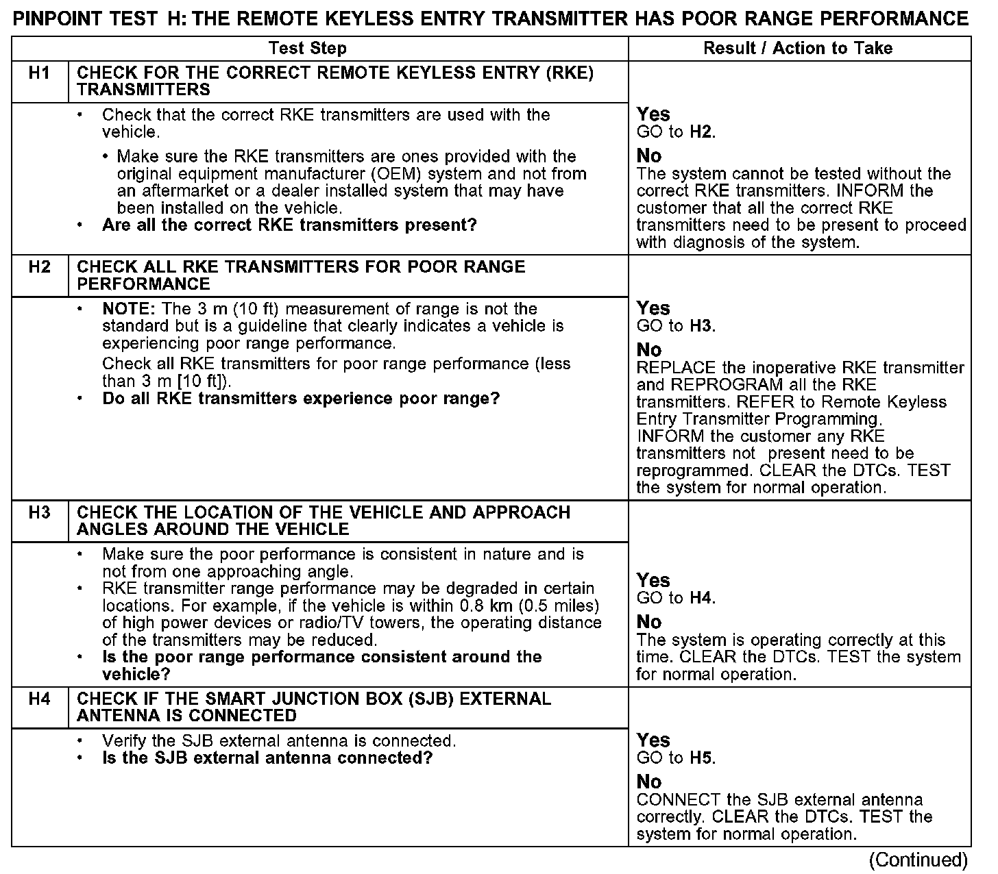 PINPOINT TEST H: THE REMOTE KEYLESS ENTRY TRANSMITTER HAS POOR RANGE PERFORMANCEH1-H4: