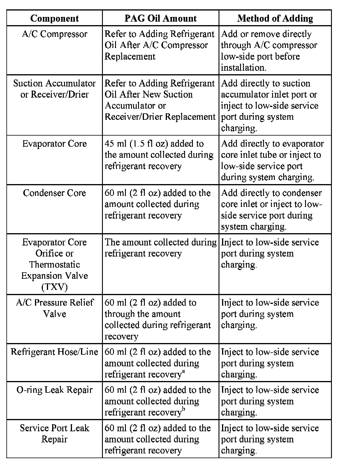 ^ If an excessive amount of PAG oil is lost due to a hose rupture/separation or other damage the total system PAG oil capacity must be added.