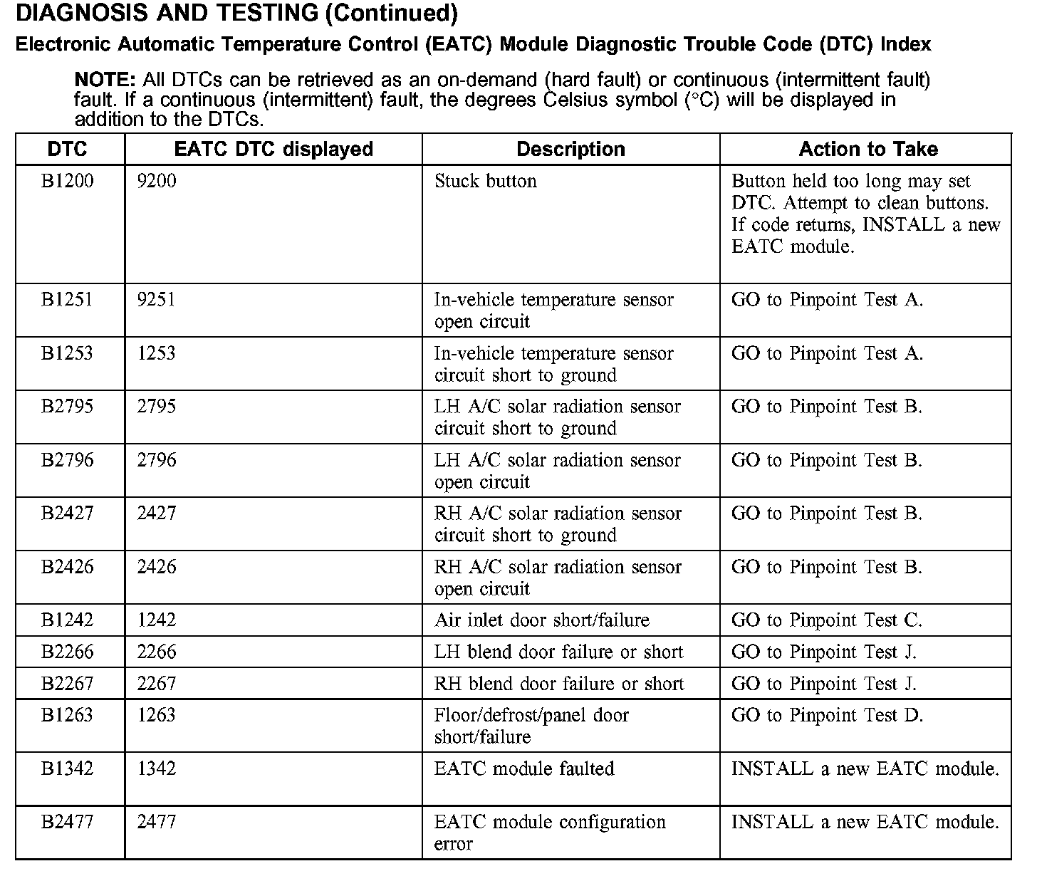Electronic Automatic Temperature Control (EATC) Module Diagnostic Trouble Code (DTC) Index