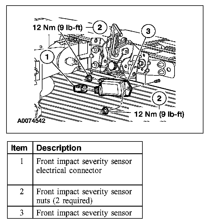 5. WARNING: The tightening torque of the air bag front impact severity sensor retaining nuts is critical for correct system operation.