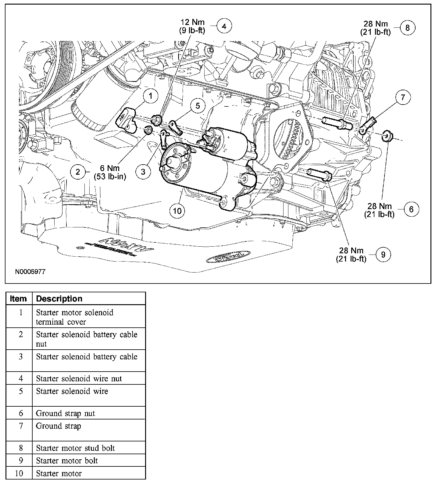 - When installing the starter motor bolts, first install the bolts hand tight, then tighten the upper stud bolt to 28 Nm (21 lb-ft), followed by the lower bolt to 28 Nm (21 lb-ft).