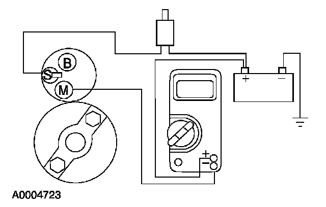 8. Remove the cables from solenoid B-, S- and M-terminals. Clean the cables and connections and reinstall the cables to the correct terminals. Repeat Steps 3 through 6. If the voltage drop reading is still greater than 0.8 volt when checked at the M-terminal and less than 0.8 volt when checked at the B-terminal, the concern is in the solenoid contacts. Install a new starter motor.