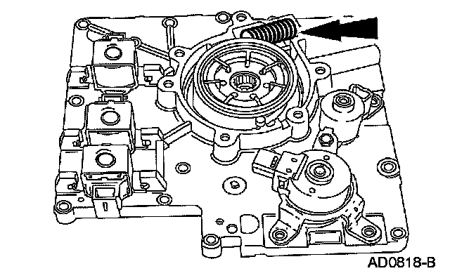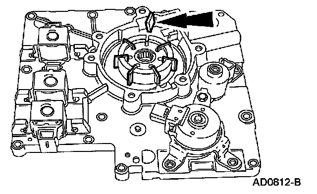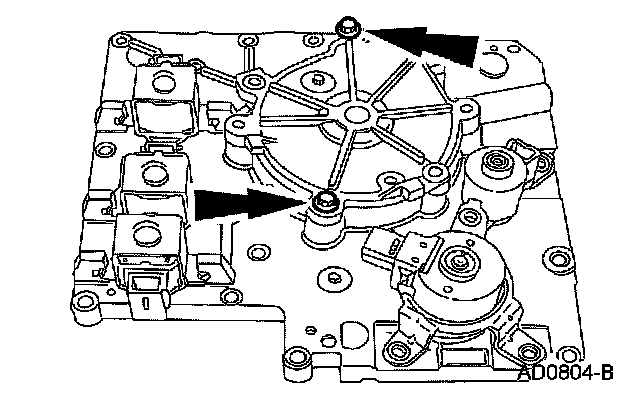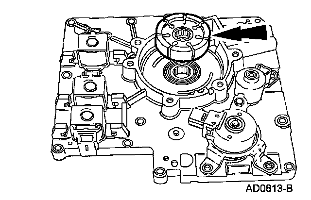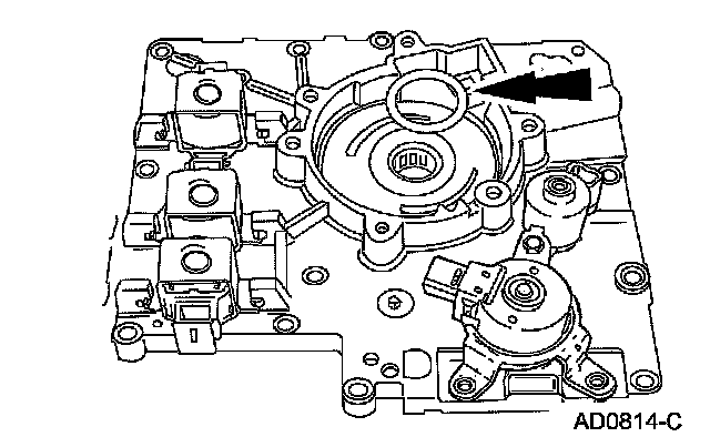 Remove the shift solenoids by pressing locking tab with a screwdriver and rotating them.