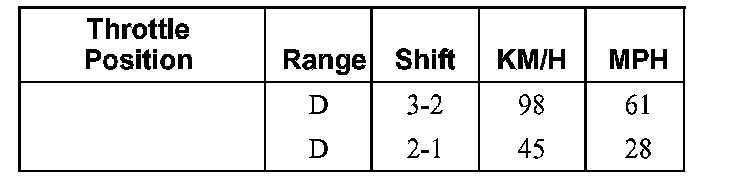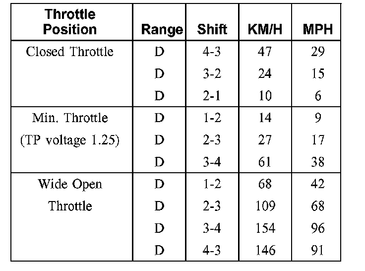 5. With vehicle speed above 43 km/h (27 mph), press accelerator pedal to floor, wide-open throttle (WOT). Transaxle should shift from third to second, or third to first, depending on the vehicle speed. The torque converter clutch should release.