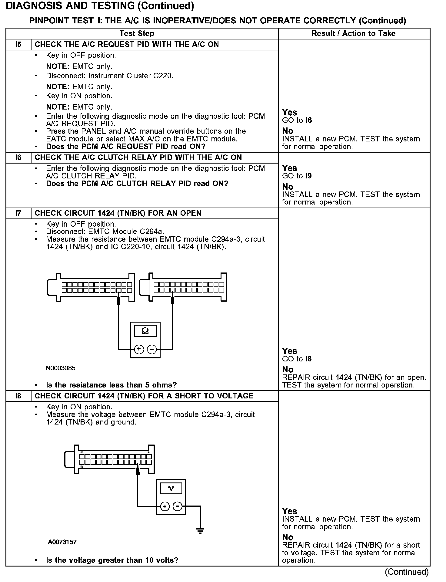 Under normal operation, when A/C is requested, a message is sent over the MSCAN bus to the instrument cluster, then from the instrument cluster through the HSCAN bus to the PCM (EATC systems) or a voltage is sent to the instrument cluster through circuit 1424 (TN/BK) then a message from the instrument cluster through the HSCAN bus to the PCM (EMTC systems).