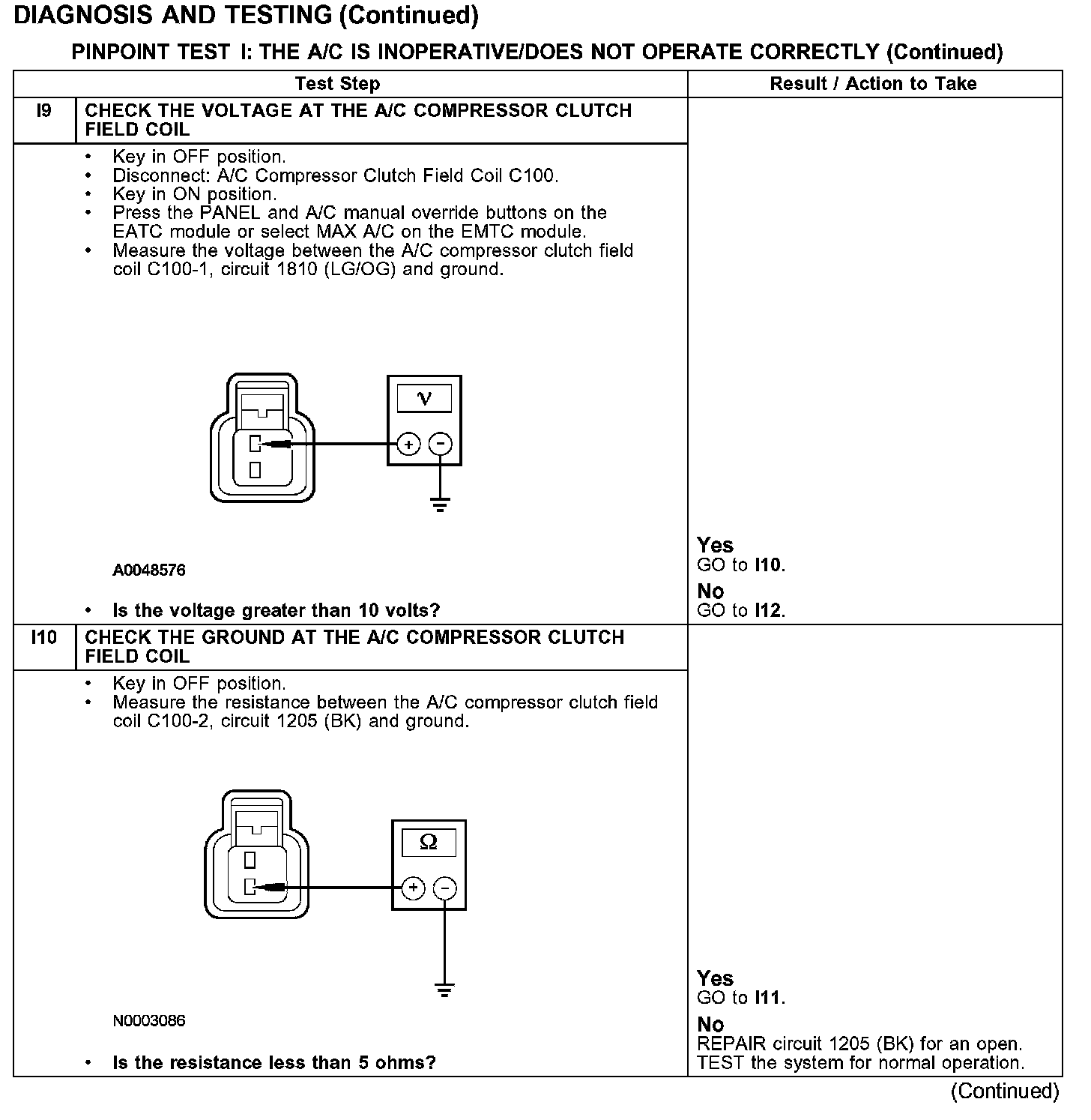 Ignition voltage for the A/C clutch relay switch is provided through circuit 3028 (DB/YE). When the PCM energizes the relay, ignition voltage is supplied to the A/C clutch through circuit 1810 (LG/OG). Ground is supplied for the A/C clutch through circuit 1205 (BK).