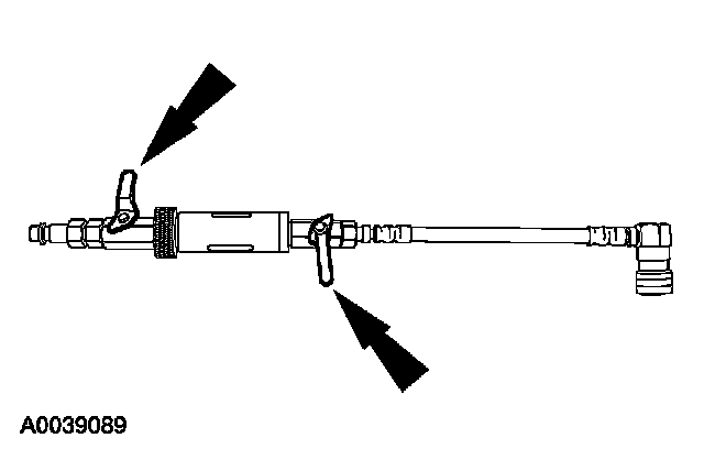 5. Install the dye/lubricant injector between the low-side service gauge port valve and the refrigerant service station or manifold gauge set.