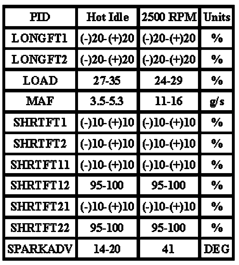 Note: All generic OBD readings under no load (PARK or NEUTRAL).