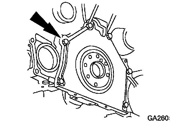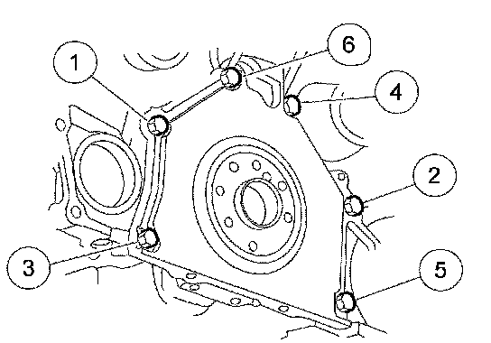 106. Install the crankshaft rear seal retainer plate and loosely install the 6 bolts.