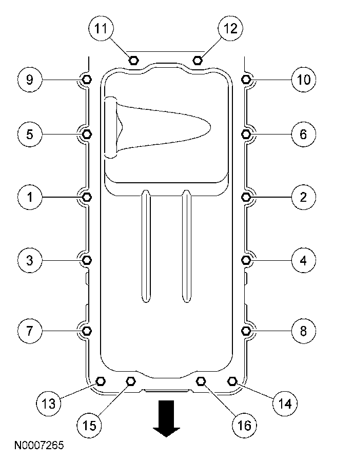 111. Install the oil pan gasket and the oil pan and loosely install the 16 bolts.