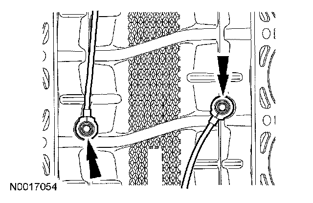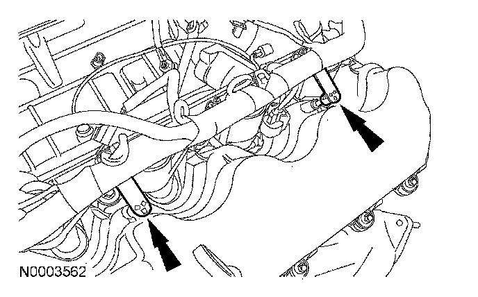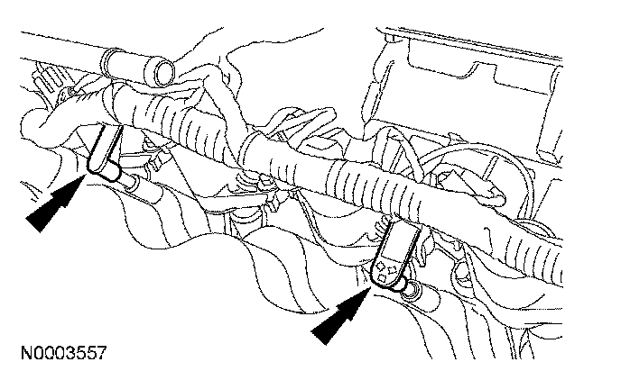 14. Disconnect the 2 engine wiring harness retainers from the LH valve cover studs.