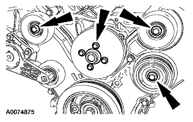 36. Remove the 7 bolts, the coolant pump pulley and the 3 accessory drive belt idler pulleys.