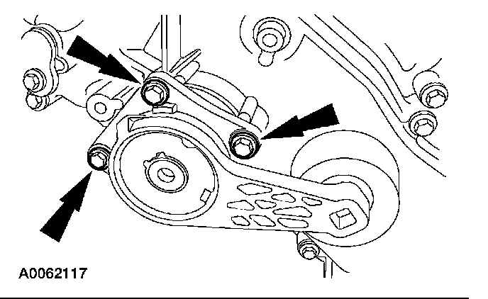 37. Remove the 3 bolts and the accessory drive belt tensioner.