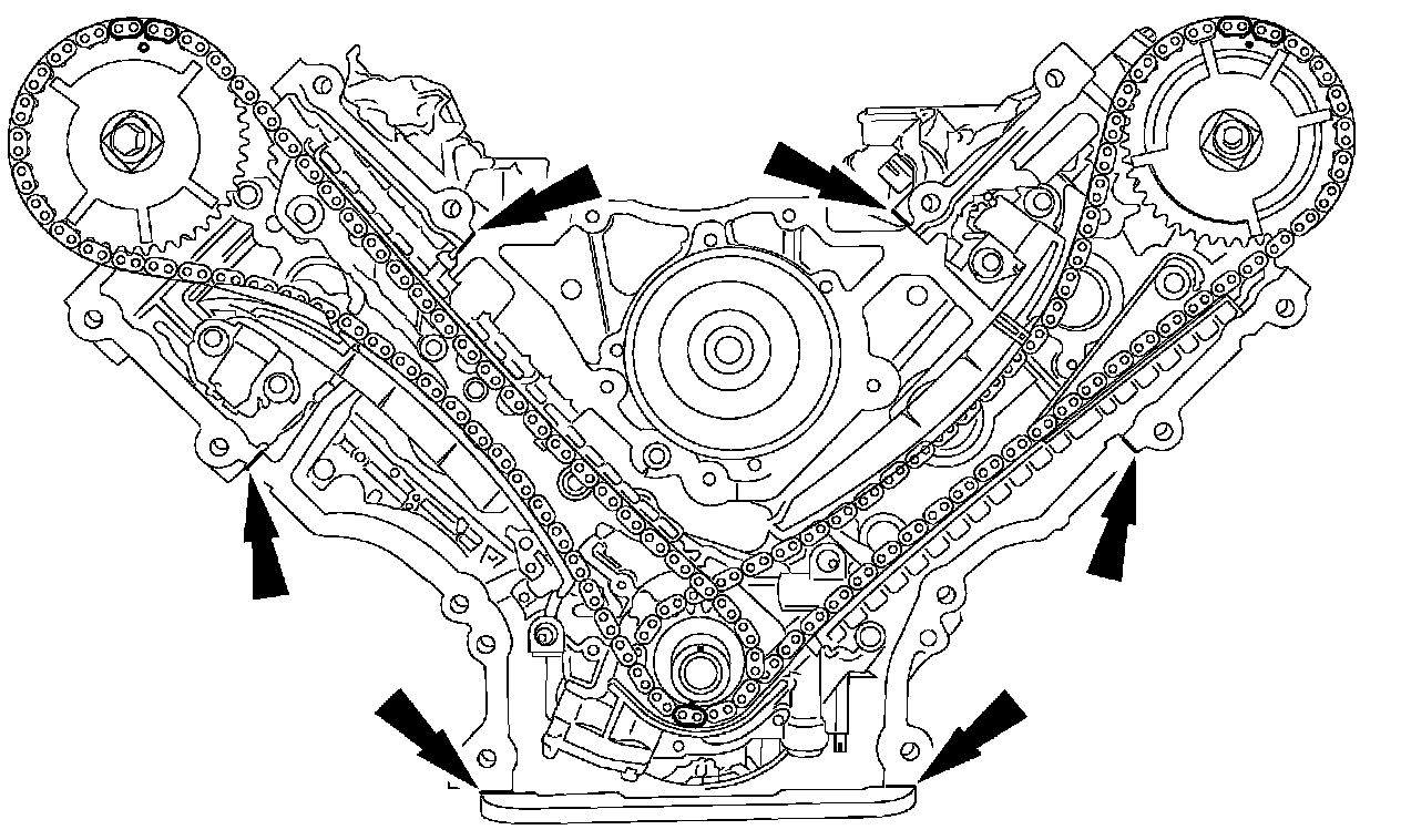 Apply a bead of silicone gasket and sealant along the cylinder head to cylinder block surface and the oil pan to cylinder block surface. at the locations shown.