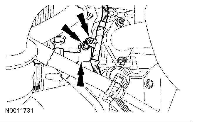 12. Install the power steering tube retaining clip and nut to the power steering stud bolt.