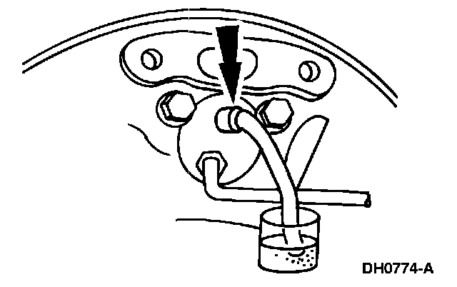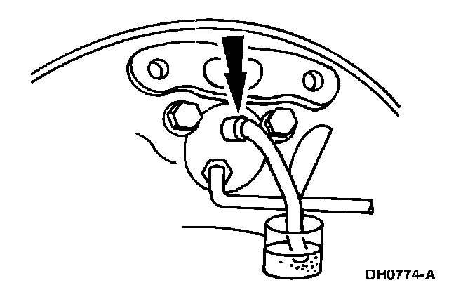 Place a box end wrench on the RH rear bleeder screw. Attach a rubber drain tube to the RH rear bleeder screw, and submerge the free end of the tube in a container partially filled with clean brake fluid.
