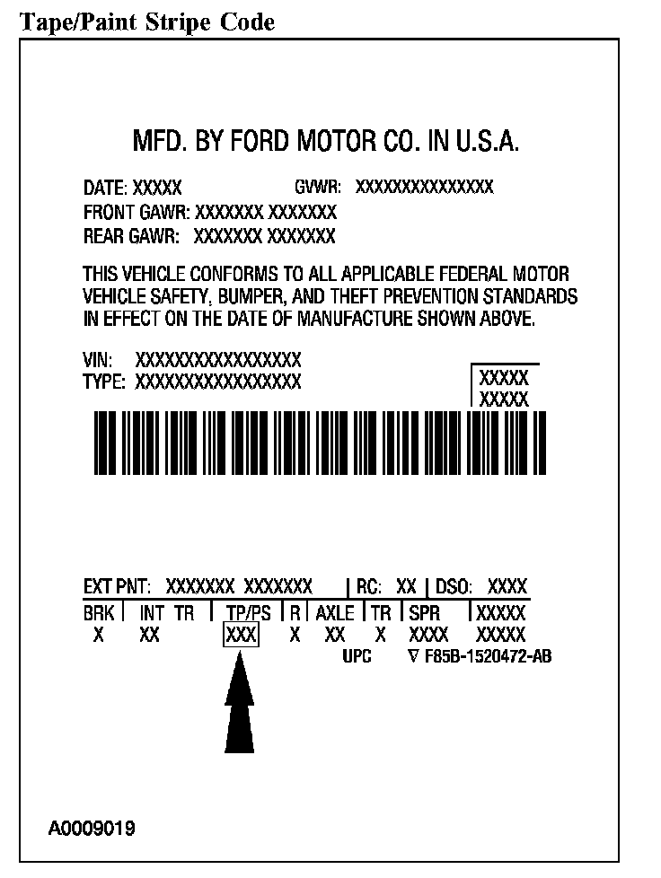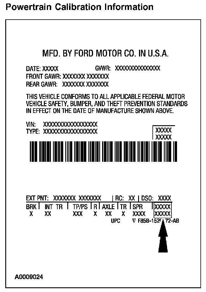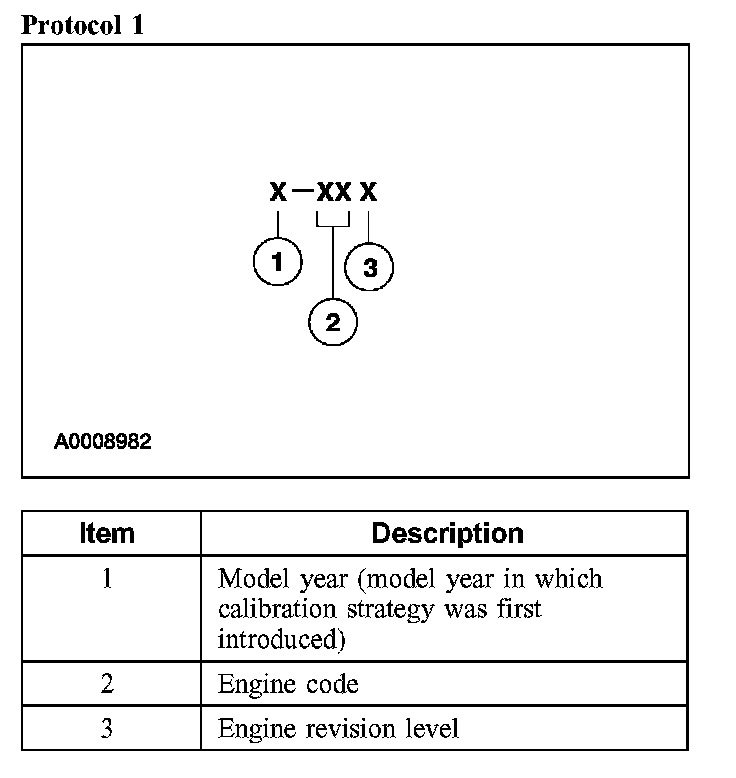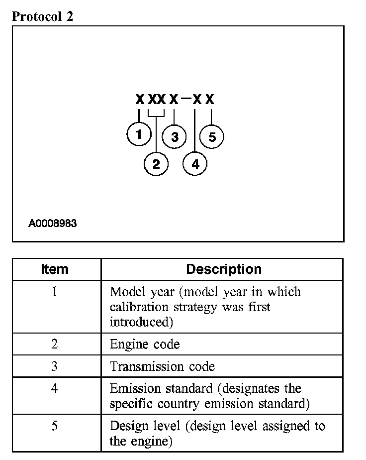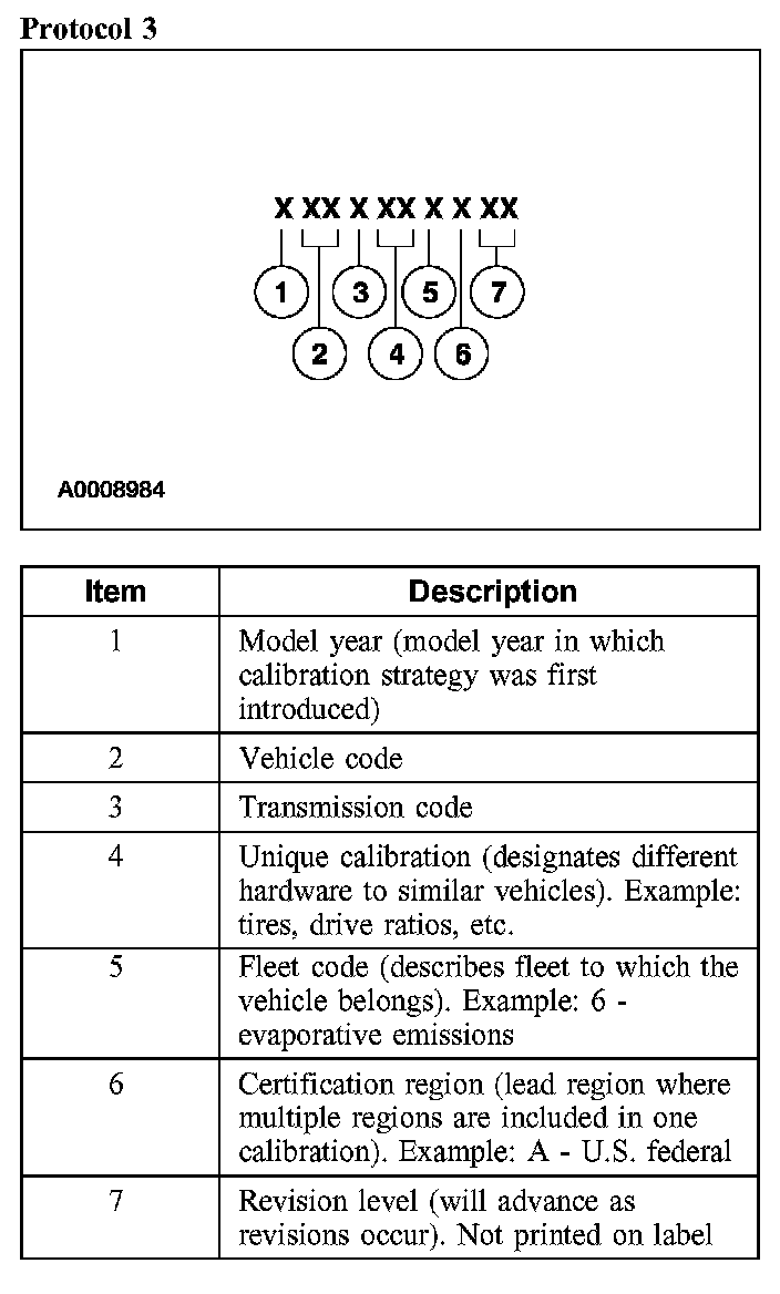 Powertrain calibration information is printed in the lower right corner of the VC label. Only base calibration information is printed. Revision levels will not appear, however, they can be found in On Line Automotive Service Information System (OASIS). For the current model year, Ford Motor Company is using three different protocols which describe powertrain base calibration. These protocols are designed to provide worldwide standardization for vehicle calibration. If the electronic calibration strategy was introduced in 1998 and carried into the current model year, Protocol 1 will be used. Refer to Protocol 1. If the electronic calibration strategy was introduced in 1999 and carried into the current model year, Protocol 2 will be used. Refer to Protocol 2. For electronic calibration strategy introduced in 2000 and beyond, Protocol 3 will be used. Refer to Protocol 3.