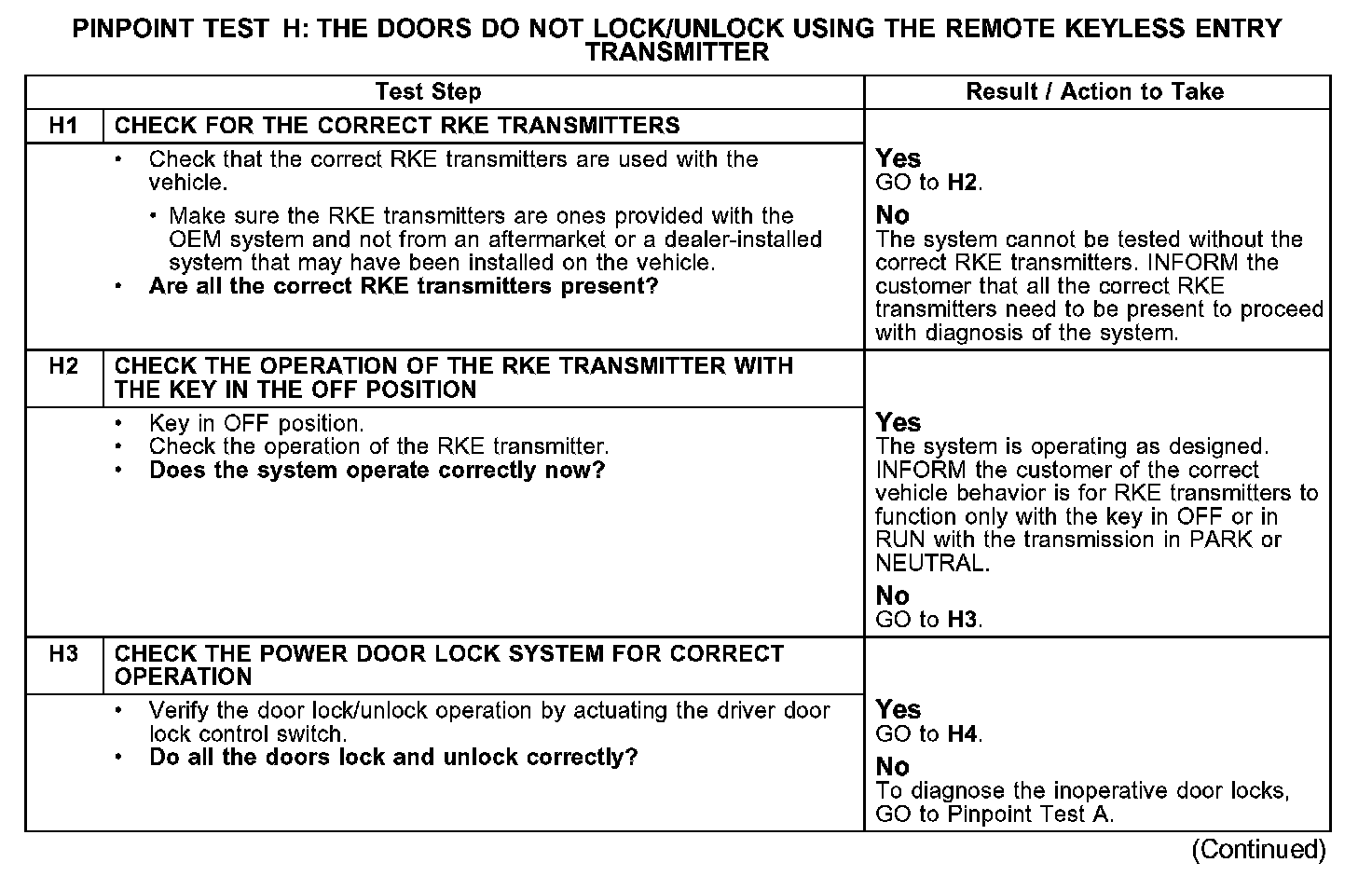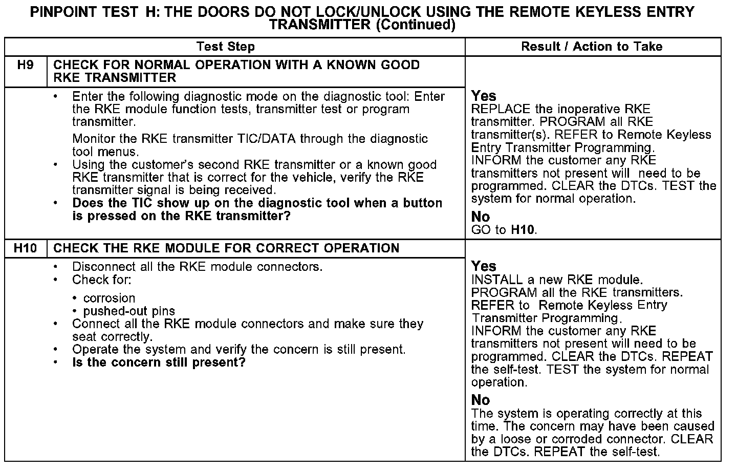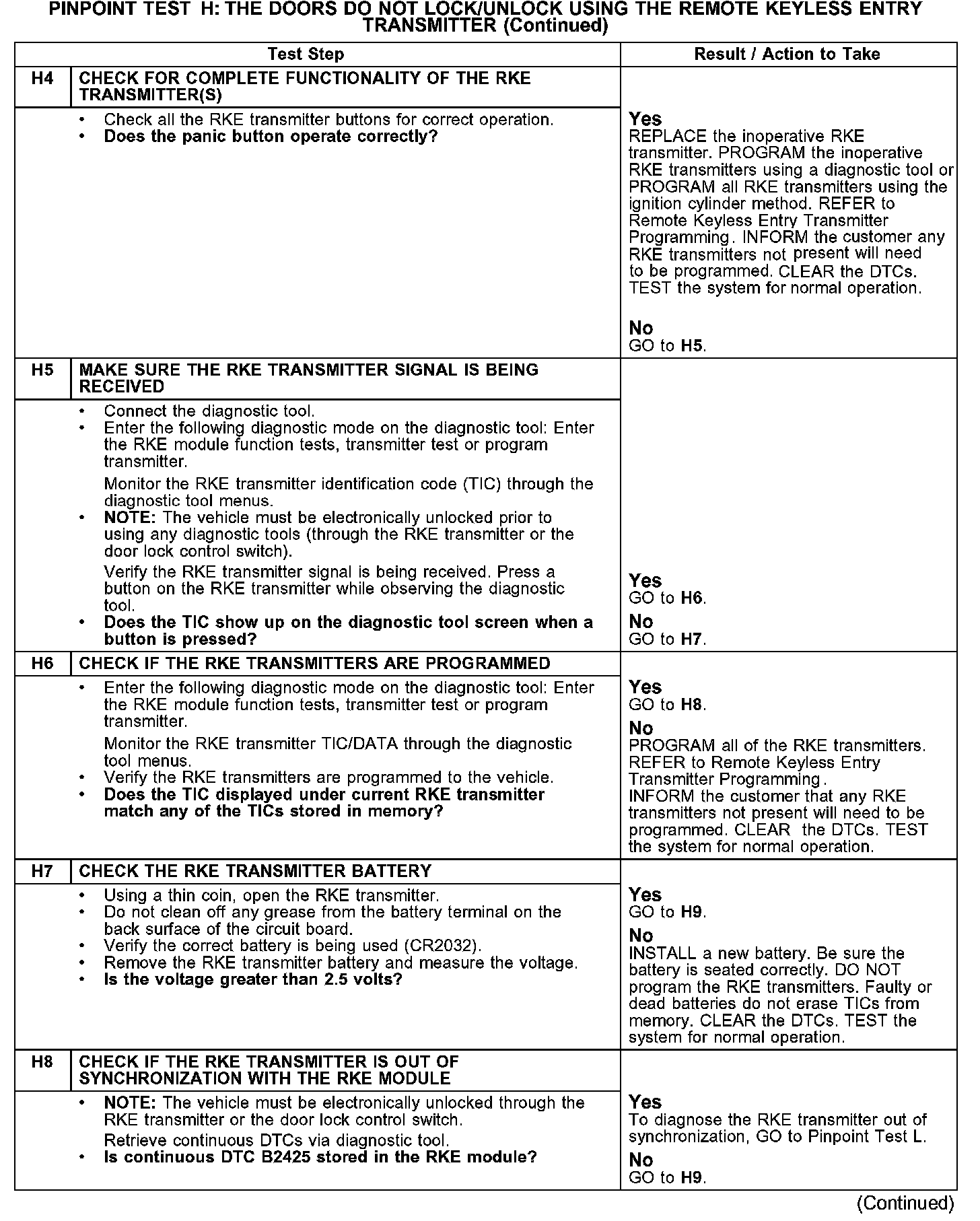 PINPOINT TEST H: THE DOORS DO NOT LOCK/UNLOCK USING THE REMOTE KEYLESS ENTRY TRANSMITTER