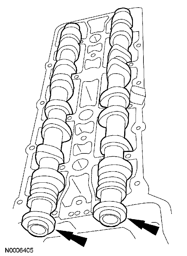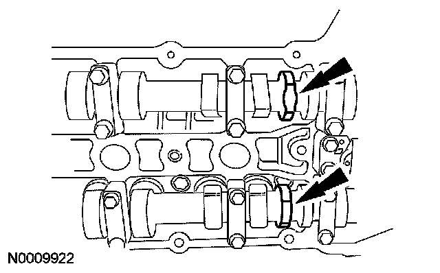 38. CAUTION: The flats on the camshaft must completely contact the special service tool or damage to the camshafts can occur. Slowly draw the special tool down evenly until it is fully seated on the camshaft flats.