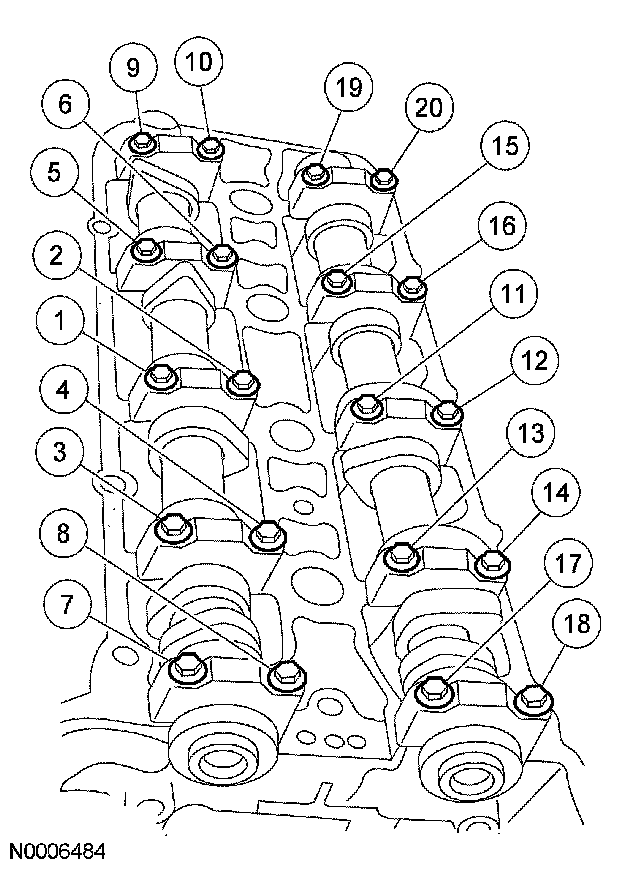10. CAUTION: Install the camshaft bearing caps. The camshaft bearing caps are positional and must be installed in their original locations and orientation or engine damage can occur.
