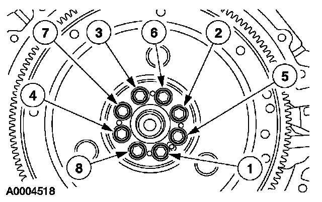 18. Install the flexplate and tighten the bolts in 2 stages in the sequence shown.
