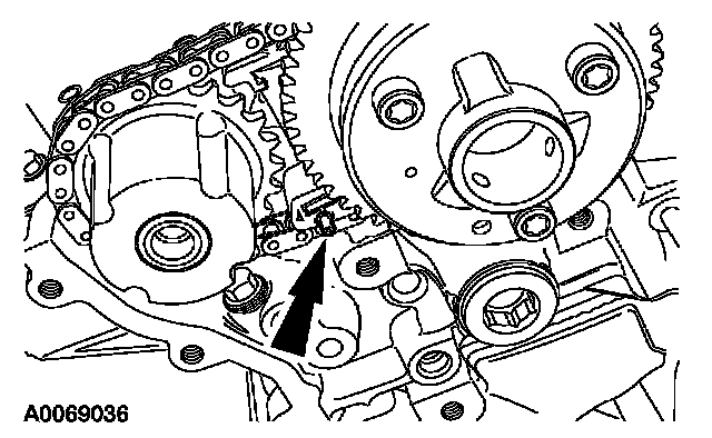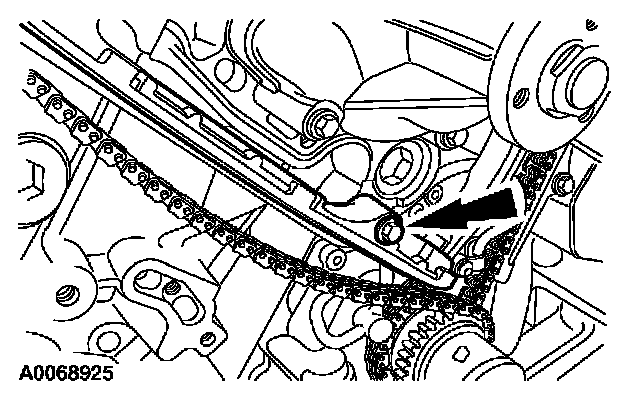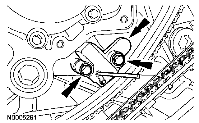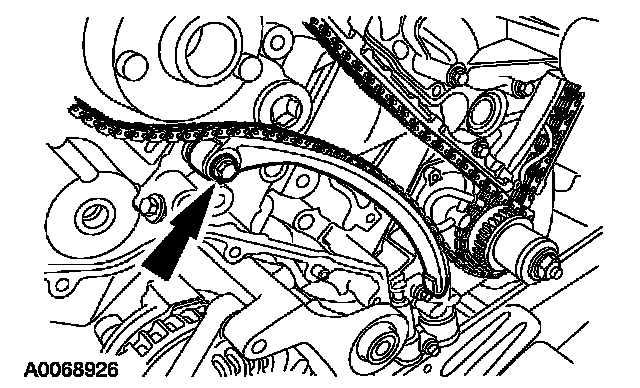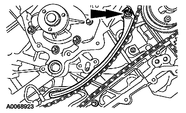 35. Install the LH timing chain tensioner. Install the timing chain tensioner and bolts, and remove the drill rod.