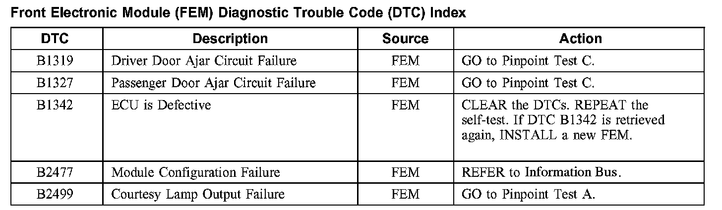 Front Electronic Module (FEM) Diagnostic Trouble Code (DTC) Index