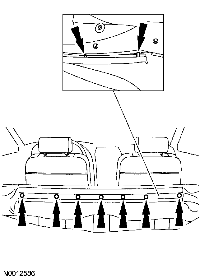 2. NOTE: The pin-type retainers are overlapped by the convertible top well cover brace and the convertible top well cover pin-type retainers.