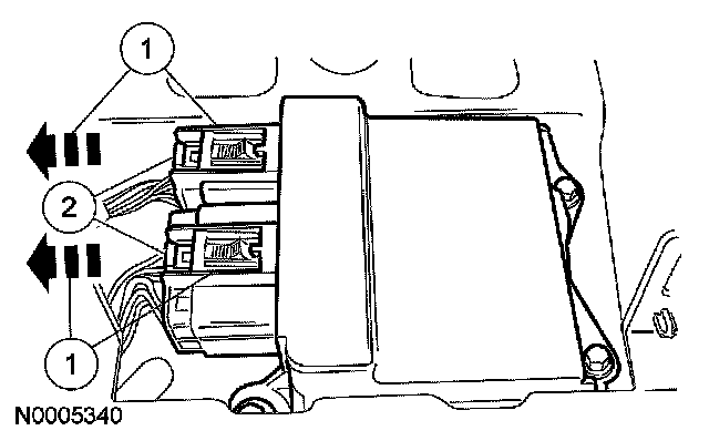 2 Depress the locking tab. Disconnect the RCM electrical connectors and remove the RCM.