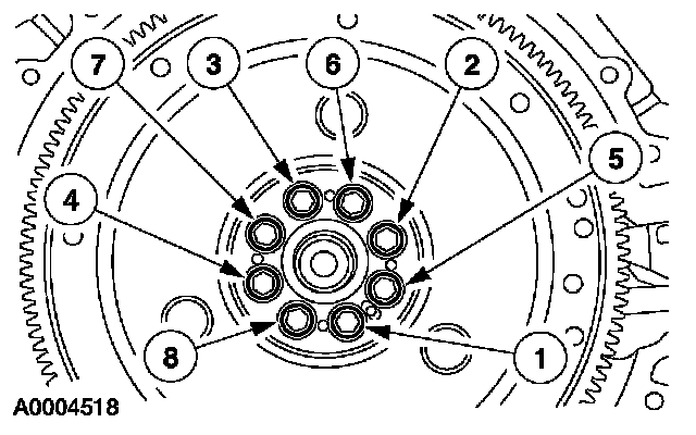 Install the 8 flexplate bolts and tighten in 2 stages in the sequence shown.