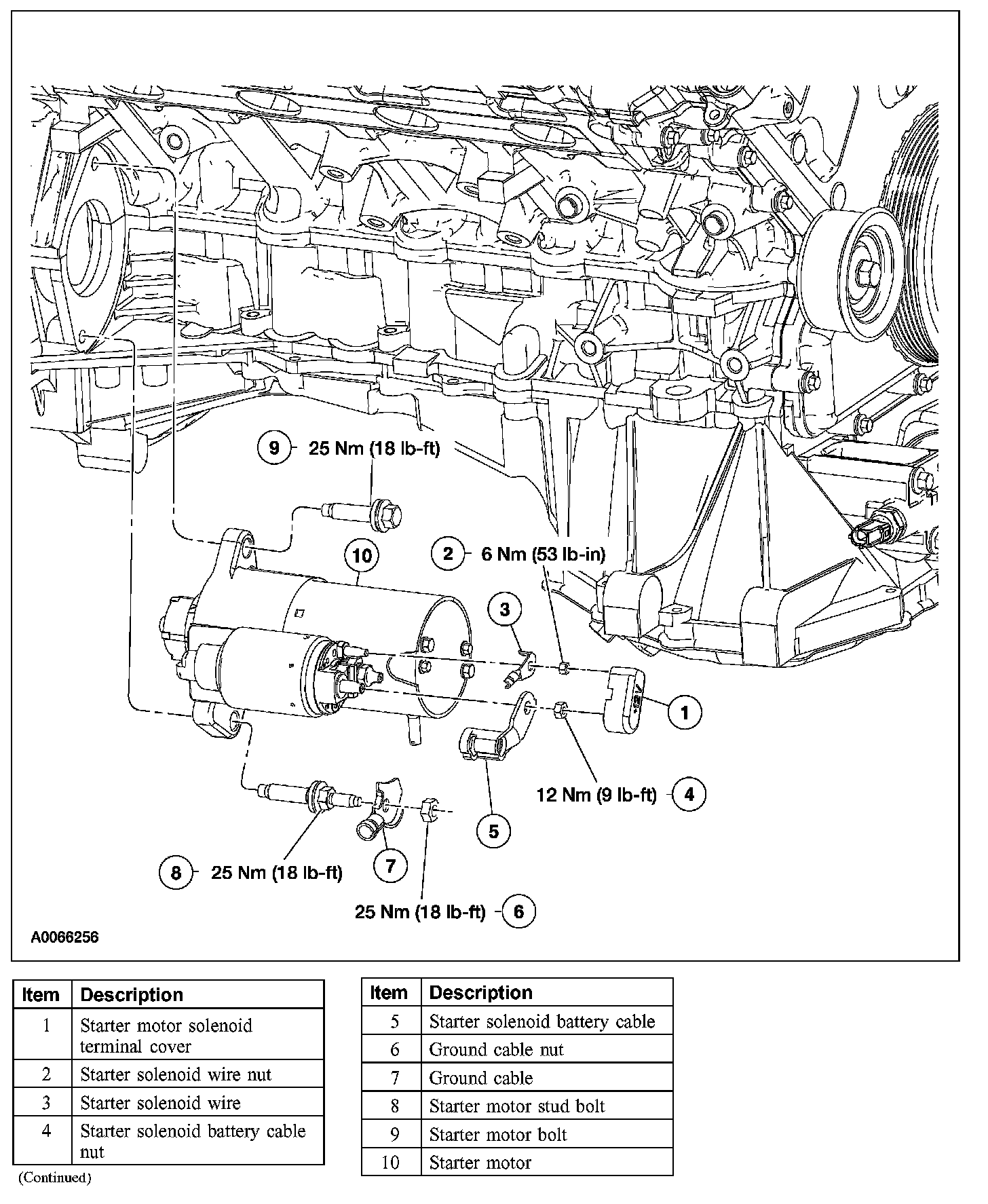 - Install the starter motor upper bolt and lower stud bolts hand-tight. Tighten the upper bolt to 25 Nm (18 lb-ft), followed by the lower stud bolts to 25 Nm (18 lb-ft).