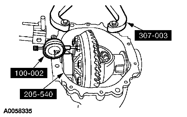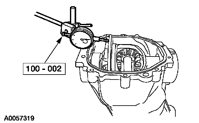 ^ Turn the differential ring gear without turning the differential pinion gear. Record the indicator reading. The allowable backlash is 0.127 mm (0.005 inch) to 0.228 mm (0.009 inch) and must not vary more than 0.076 mm (0.003 inch) between points measured. A backlash variation of more than 0.076 mm (0.003 inch) between points checked indicates gear/case runout.