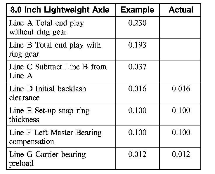 To determine the bearing shim thickness, add lines A, F and G. Subtract line C and D from the sum. Example: