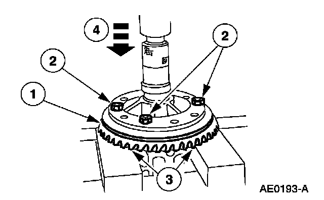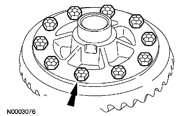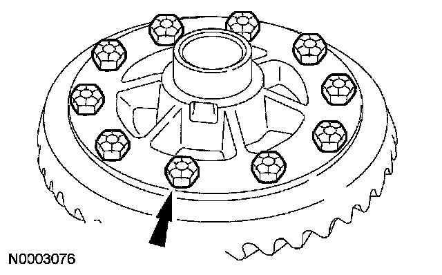32. Remove the differential ring gear bolts. Apply Stud and Bearing Mount TA-27 meeting Ford specification WSK-M2G349-A1 to the differential ring gear bolt threads, and reinstall the differential ring gear bolts.
