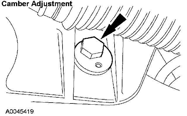 Camber is adjusted by rotating cam bolts that are located at the forward pivot bushing of the lower control arms. A retaining flag must be removed and discarded prior to adjusting.