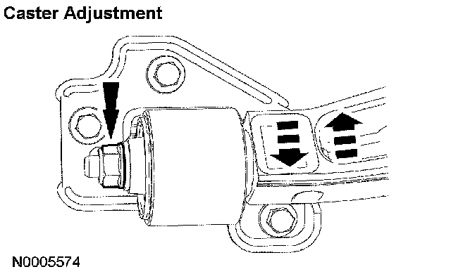 Caster is adjusted by loosening the lower arm rearward pivot bushing nut and moving the arm inward or outward. When adjusting the LH caster, a centering washer must be removed and discarded prior to adjusting.