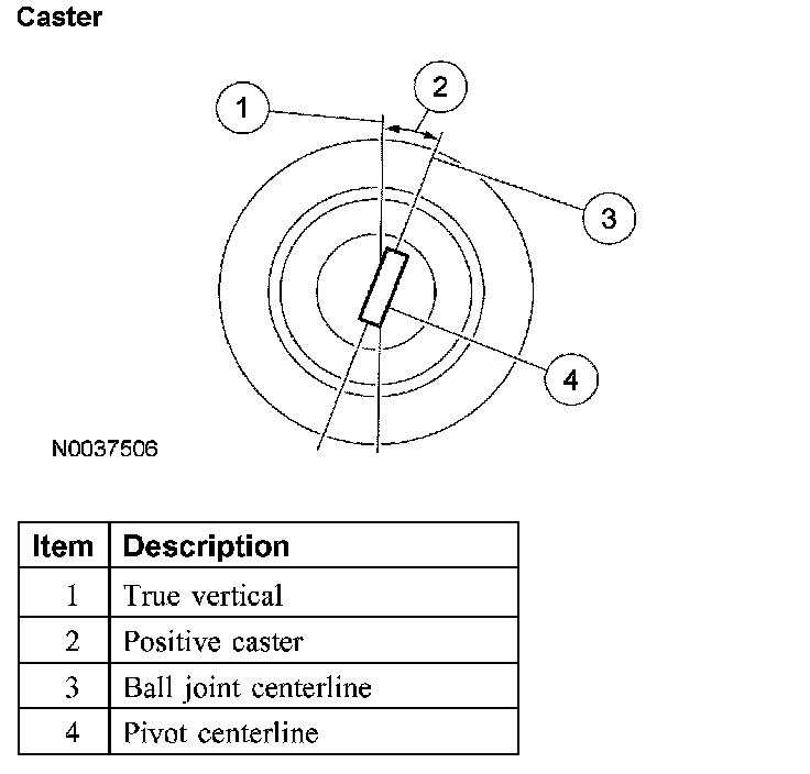 Caster is the deviation from vertical of an imaginary line drawn through the ball joints when viewed from the side. The caster specifications will give the vehicle the best directional stability characteristics when loaded and driven. The caster setting is not related to tire wear.