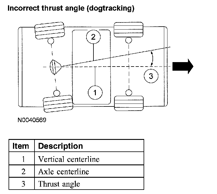 Incorrect thrust angle (dogtracking) is the condition in which the rear axle is not square to the chassis. Heavily crowned roads can give the illusion of dogtracking.