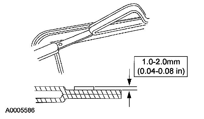 Using an appropriate tool, trim the urethane adhesive leaving a 1-2 mm (0.04-0.08 in.) base of original equipment urethane on the pinch weld.