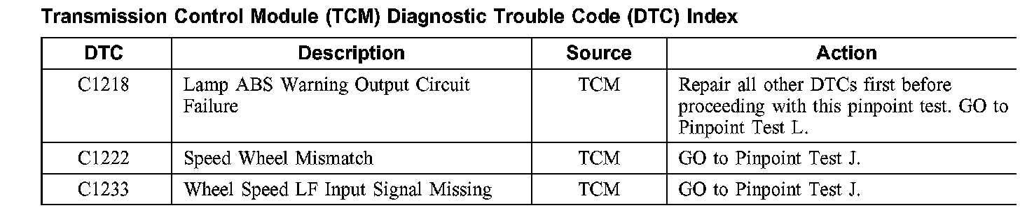 Transmission Control Module (TCM) Diagnostic Trouble Code (DTC) Index