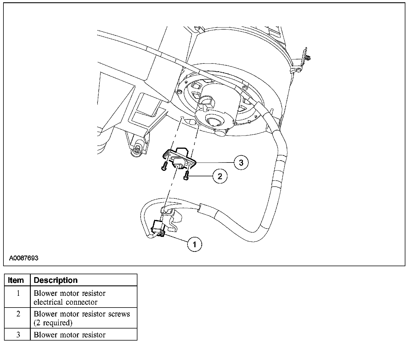 3. Remove the 2 screws and the blower motor resistor.