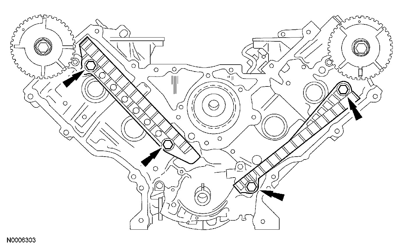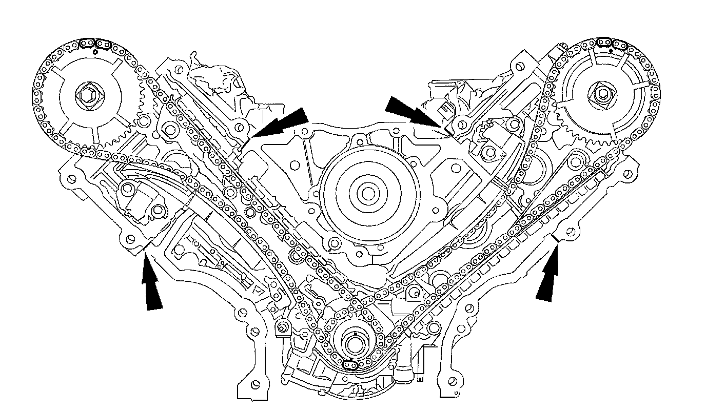 45. NOTE: The lower half of the timing chain must be positioned above the tensioner arm dowel.