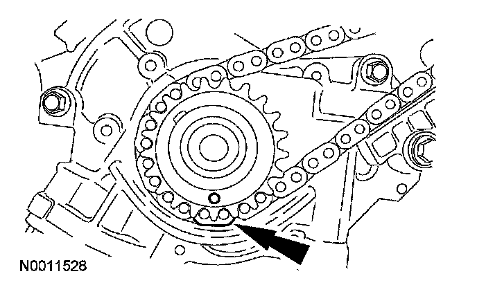 Position the RH timing chain on the VCT phaser sprocket with the timing mark positioned between the 2 copper (marked) chain links.