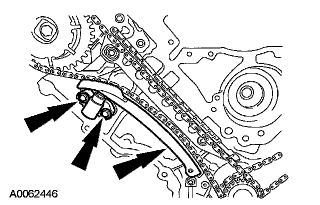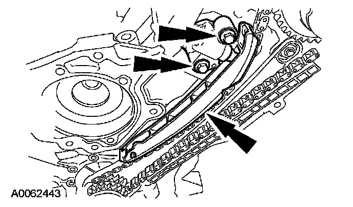 46. Position the RH timing chain tensioner arm on the dowel pin and install the RH timing chain tensioner and bolts.