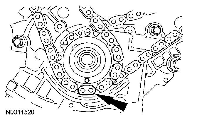 40. Position the lower end of the LH (inner) timing chain on the crankshaft sprocket, aligning the timing mark on the outer flange of the crankshaft sprocket with the single copper (marked) link on the chain.