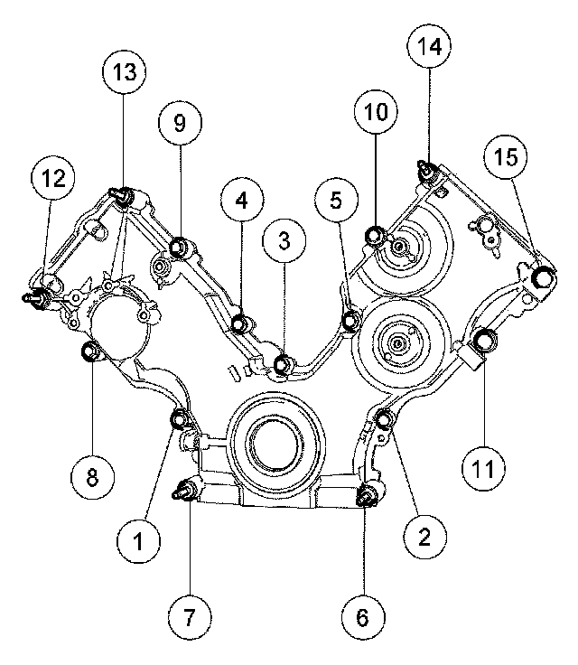 53. Tighten the engine front cover fasteners in sequence in 2 stages.
